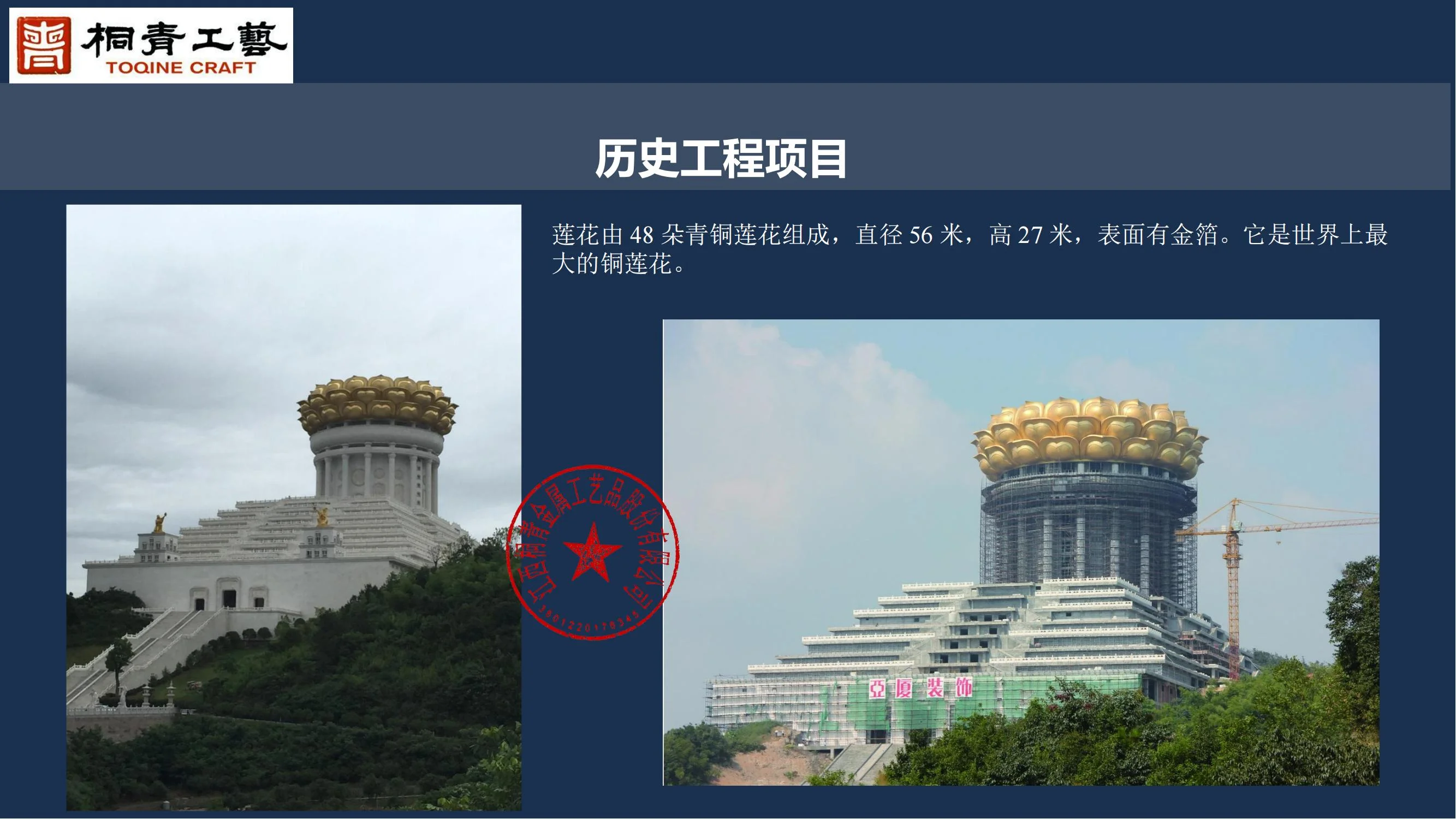この蓮華は48個の青銅製の蓮の花で構成され、直径56メートル、高さ27メートル、表面には金の箱が置かれています。これは世界最大の青銅製の蓮華です。